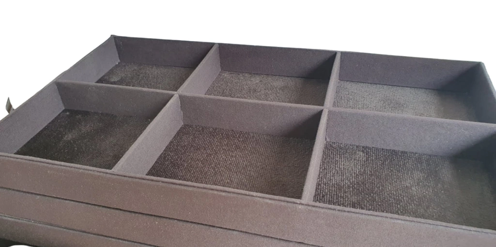 Cada bandeja com 6 divisórias medindo cada divisória 10x12cm.