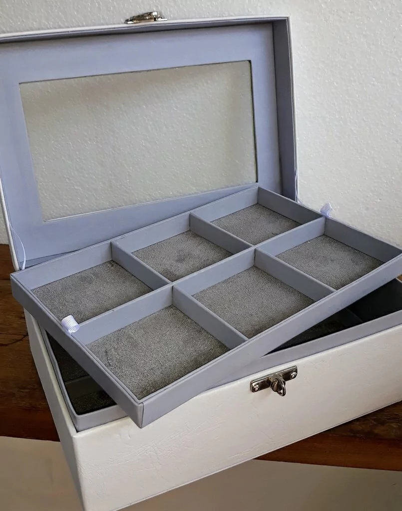 Porta Joias e Bijuterias Grande Branco e Cinza com 5 Andares e Visor! Este lindo organizador é perfeito para quem ama manter suas joias e bijuterias sempre à vista e bem organizadas. Com 5 andares, você encontra: 1) divisórias para anéis e pequenos acessórios. 2) espaço amplo para colares e brincos. 3) compartimentos sem divisórias para peças maiores. O visor de vidro na tampa permite que você admire suas peças favoritas sem precisar abrir a caixa. Além disso, vem com pezinhos para proteger a base e um trinco que possibilita a colocação de um cadeado.