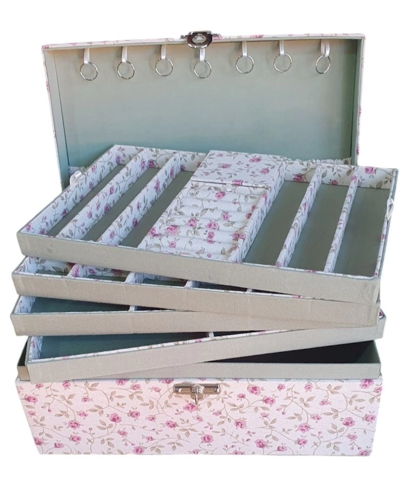 Este porta joias possui um design floral encantador e é composto por 4 andares de divisórias, proporcionando espaço suficiente para todos os seus acessórios. Com diversas divisórias e argolinhas para correntes na tampa, suas peças estarão sempre bem organizadas e à mão.
